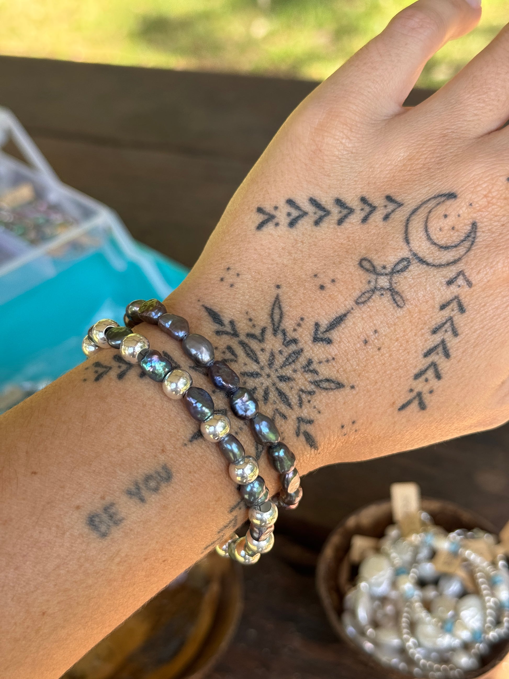 A string of black freshwater pearls and .925 sterling silver beads - secured with a .925 sterling silver clasp.