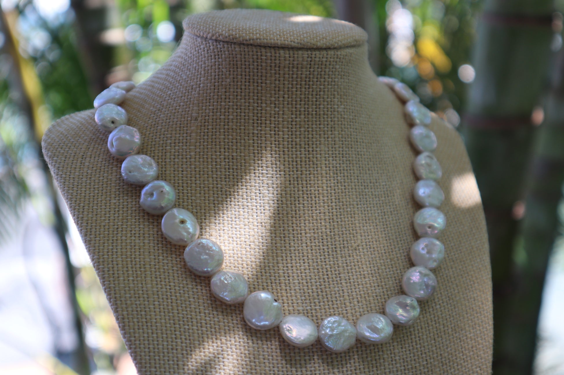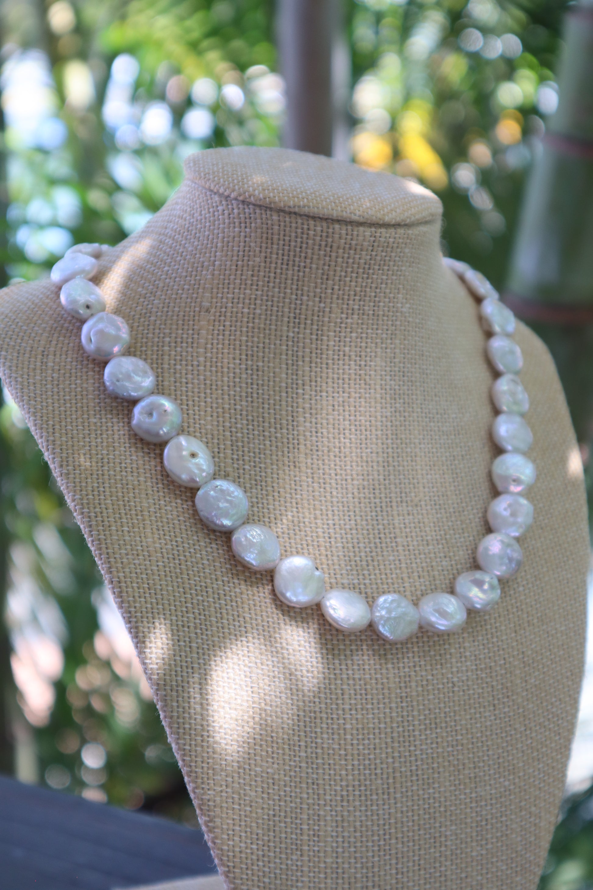 A string of freshwater coin pearls - secured with a .925 sterling silver clasp. A perfect statement piece that can also be stacked.