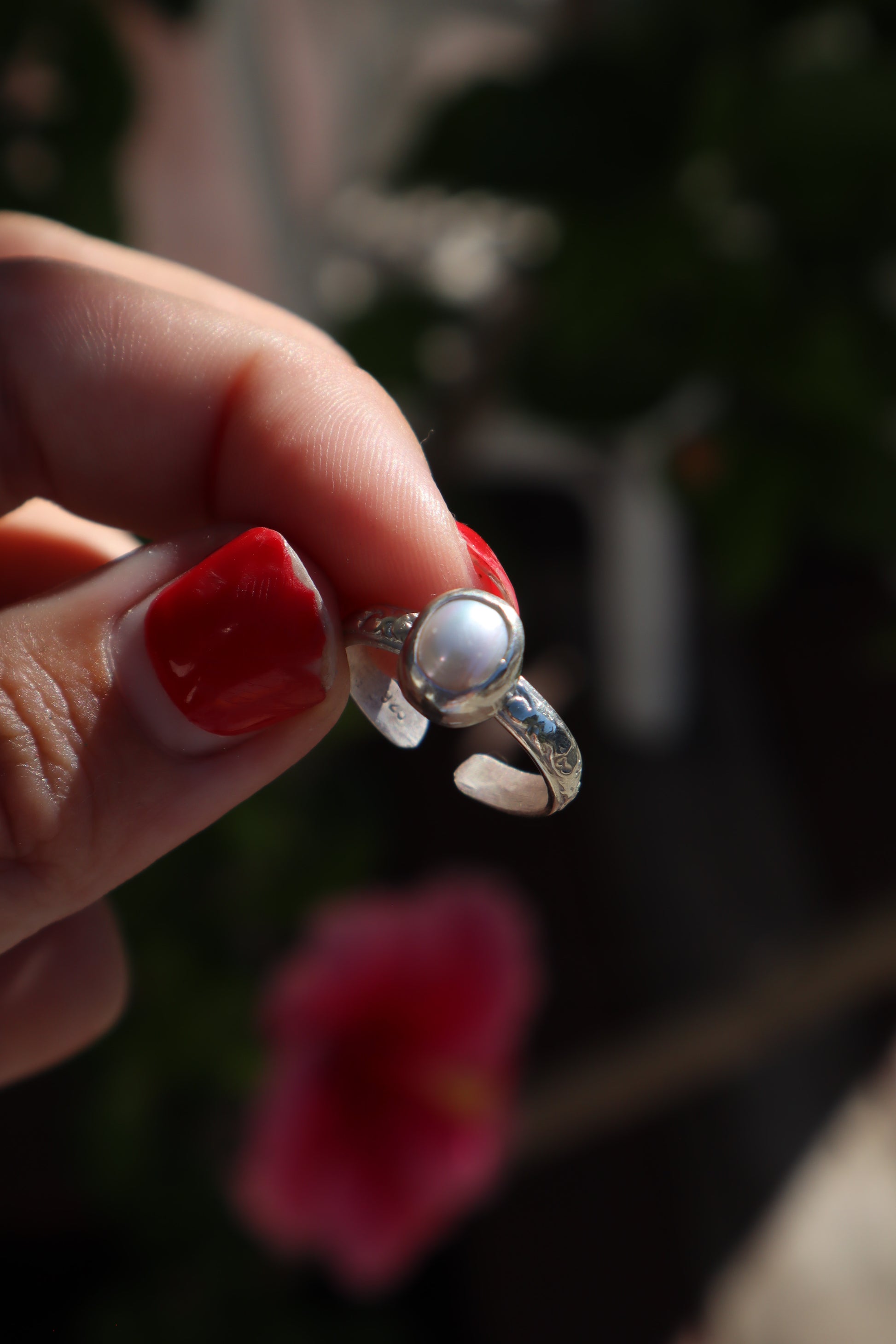 A freshwater pearl set in .925 sterling silver on patterned .925 sterling silver adjustable ring band.